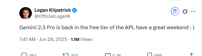 Gemini2.5Pro API 免费回归,开发者社区热烈响应...
