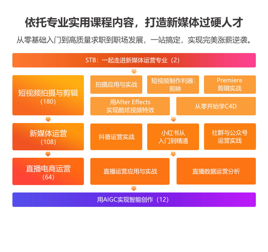 3个模块;27个章节;150+技能点;20+新媒体营销方法